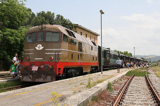 della zona. Qui il treno, con una 432 appena restaurata dai soci dell'Italvapore, a Monte Antico, il punto d'inversione di marcia per proseguire verso Asciano.