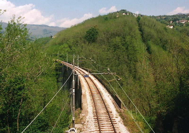 Da sopra il portale nord della galleria Rovina verso il ponte di Fabbricaccia. Foto Bosco - agosto 1999.