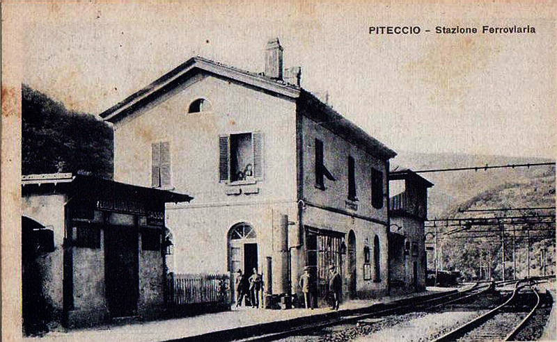 Antica foto di estrema suggestione della stazione di Piteccio, con i figli del capostazione seduti sul marciapiede con il loro cagnolino.