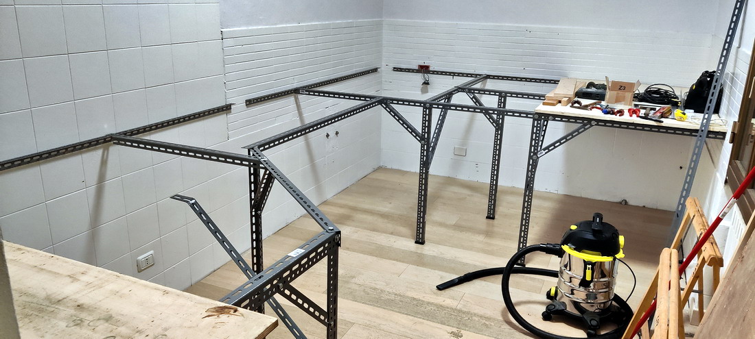 Sta prendendo forma il piano su cui sarà posato il tracciato di prova per i modelli. Sarà composto da più binari ad osso di cane alimentati con i sistemi DC, DCC ed a 3 rotaie, per un test veloce delle prestazioni e delle caratteristiche dei nostri modelli. In foto la struttura di sostegno. Aggiornamenti col procedere dei lavori: nella foto lo stato dell'arte nel dicembre 2024.