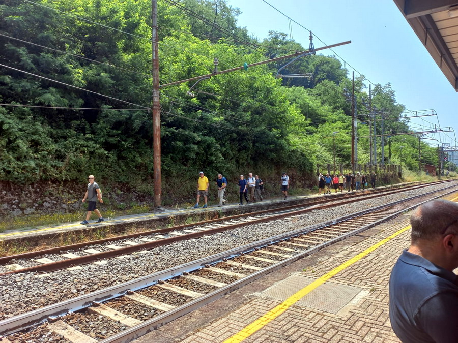 Il ritorno verso la stazione, tramite il sentiero che arriva all’apice del binario di salvamento di Piteccio. Perfettamente in orario per rinfrescarsi e rifocillarsi con un lauto spuntino: Piatto di trenette al sugo, tagliere toscano, bevande e caffè. Anche questa volta la collaborazione con il circolo di Piteccio ha confermato l’ottima qualità del cibo e la puntuale logistica. Il tavolo era disposto sotto la tettoia ed è stato bello vedere fermarsi il treno durante il desco…